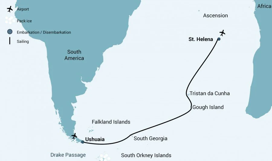 第三種路線十分特別,從烏斯懷亞出發、造訪完雙島後,接續會一路前往有著「最偏遠島嶼」 之稱的Tristan de Cunha - 每年只有2次從南非開普敦出發及折返的航班會經過這裡。行程的終點包含但不限於:拿破崙逝世的聖赫勒拿島、南非的開普敦、以及葡萄牙。這種行程價格是1萬美金有找,所需天數在25天左右。
