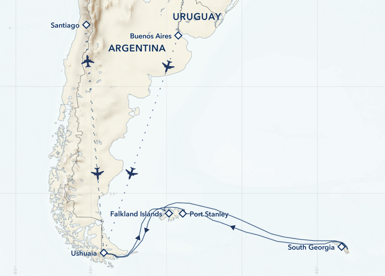 這種行程比較單純,首先需要先從智利搭乘飛機飛往福克蘭群島,或是從阿根廷登船前往,待完成福克蘭群島的行程後,接續再耗時兩天開船前往南喬治亞島。這種行程多半是安排在季節初期的10月底或2月底,價格在10395美金起。此外,下一季也有載客量少於50人的小船公司,推出僅造訪南喬治亞島的深度單島行程。